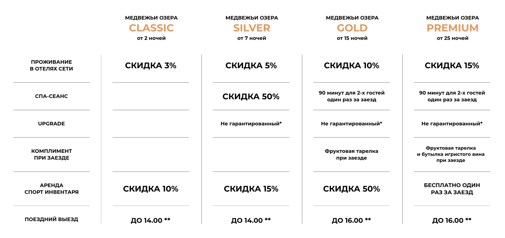 * предоставляется при наличии свободных номеров более высокой категории, опция доступна за исключением праздничных и каникулярных дней. ** предоставляется исходя из загрузки отеля и согласовывается с администратором в день выезда.