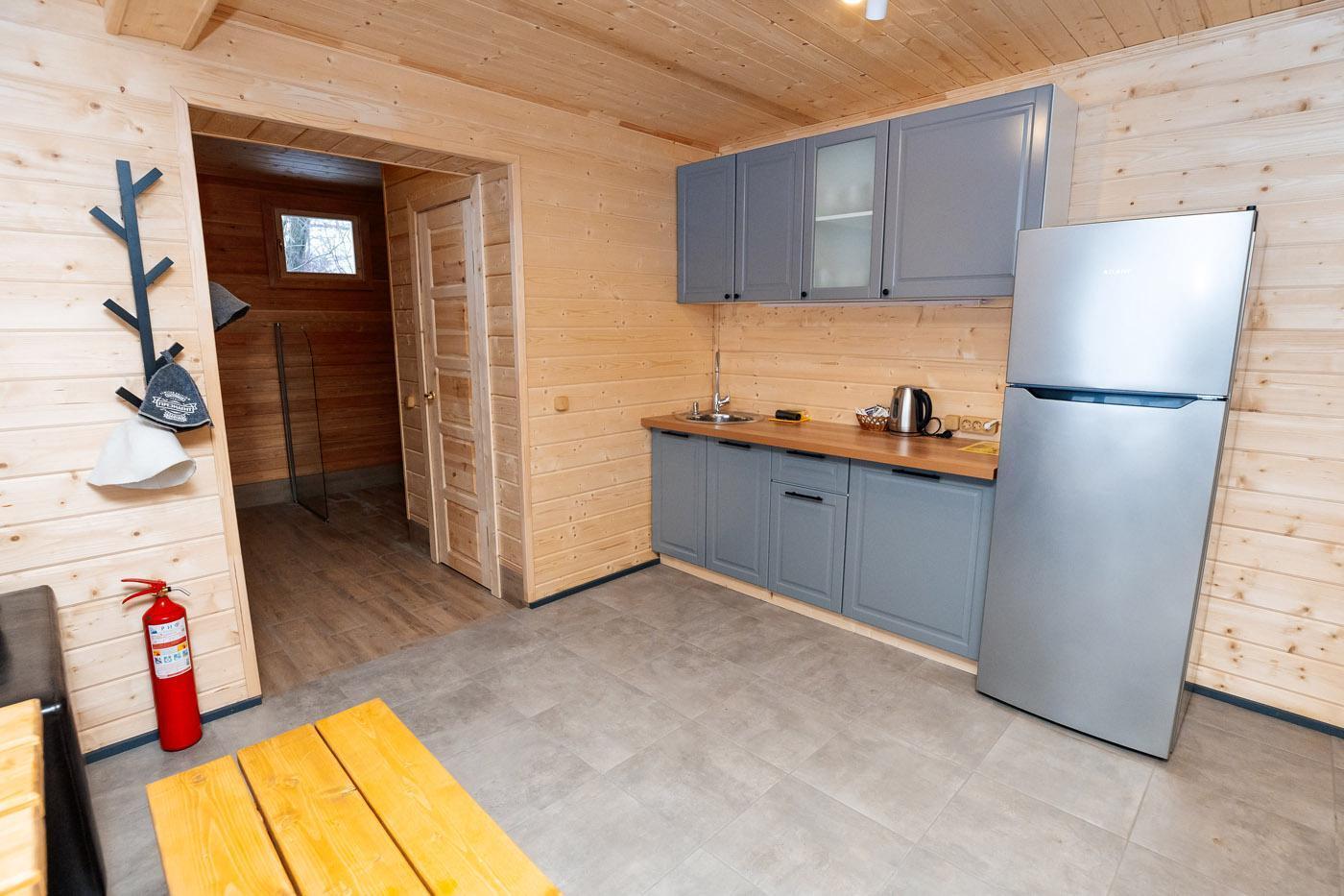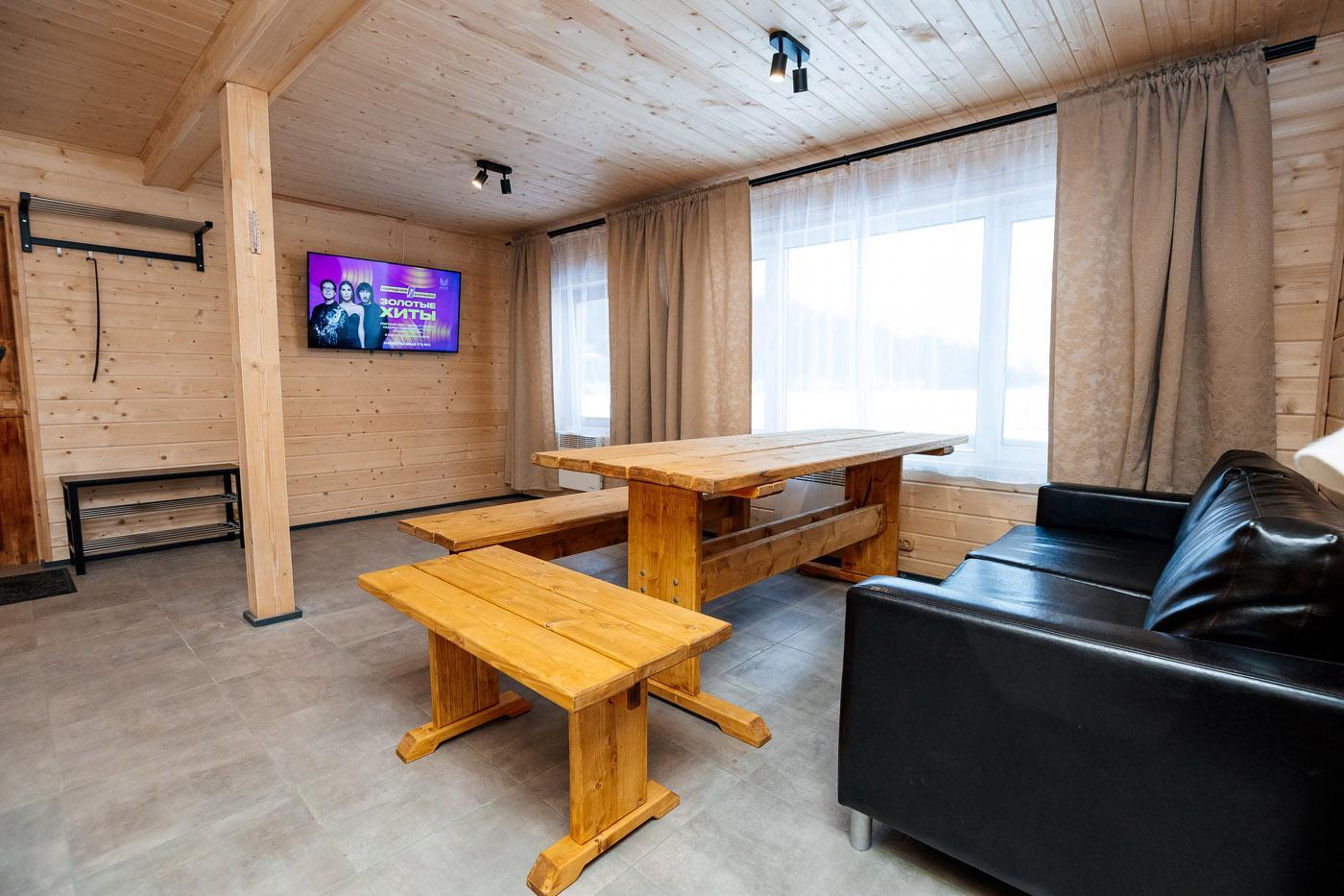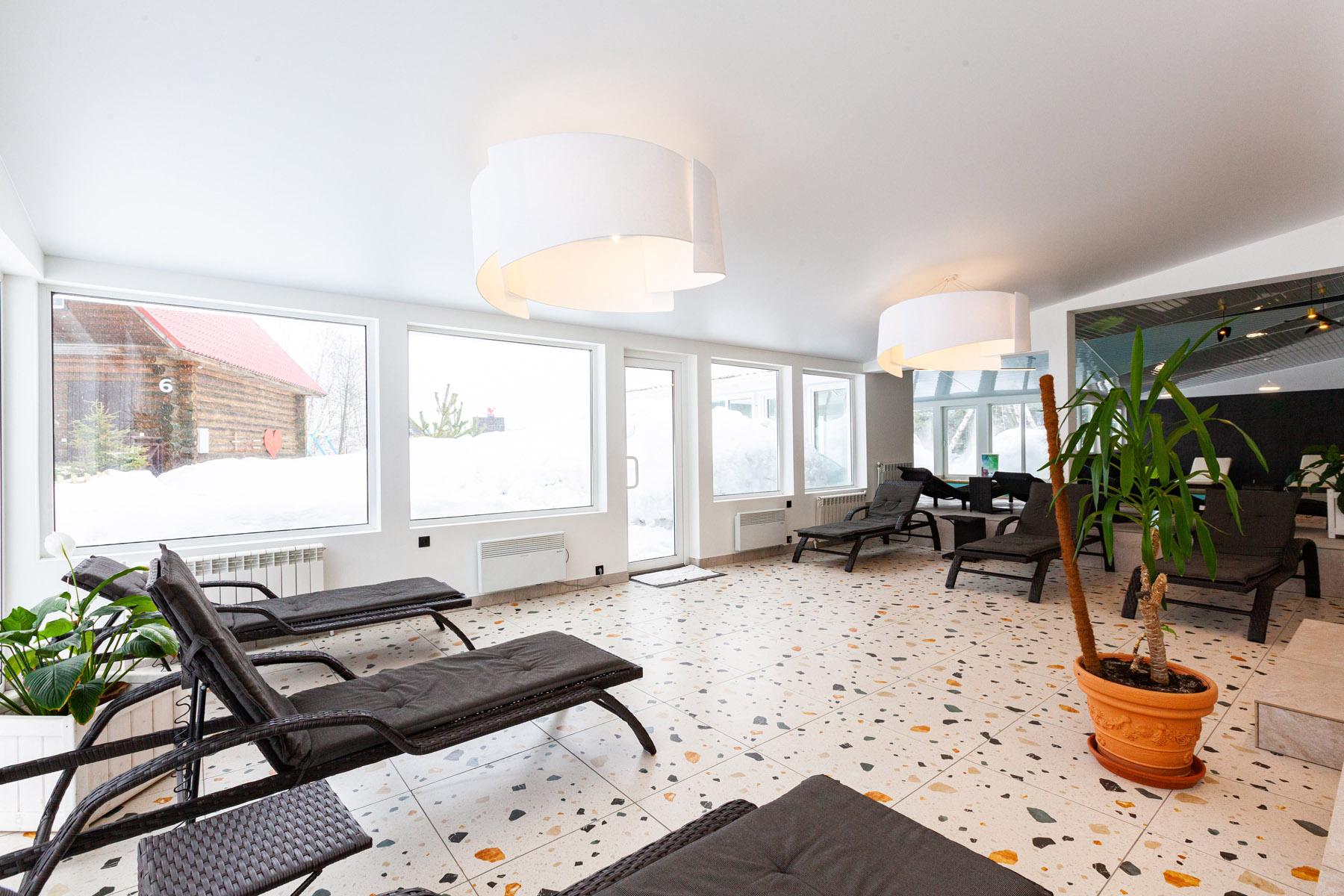 Большая парная, стол для парения и спа процедур, зона отдыха с видом на Большое Медвежье озеро и релакс зона с оборудованной кухней.