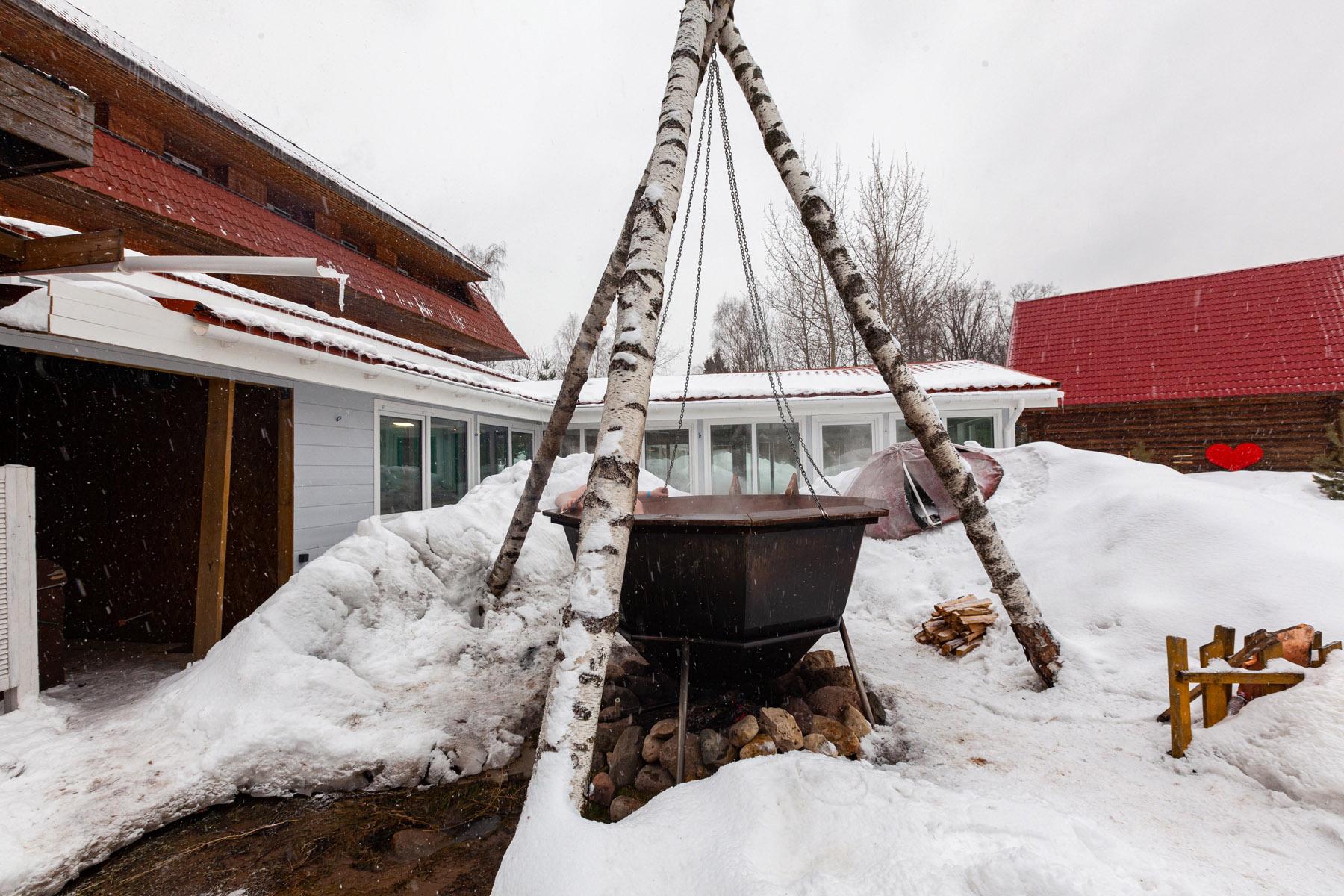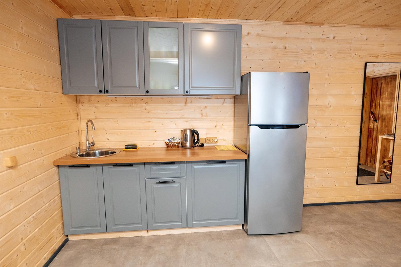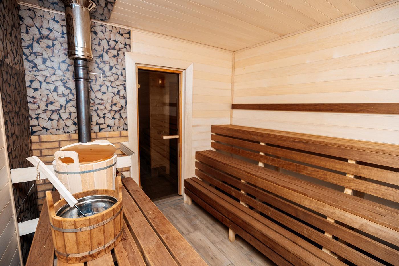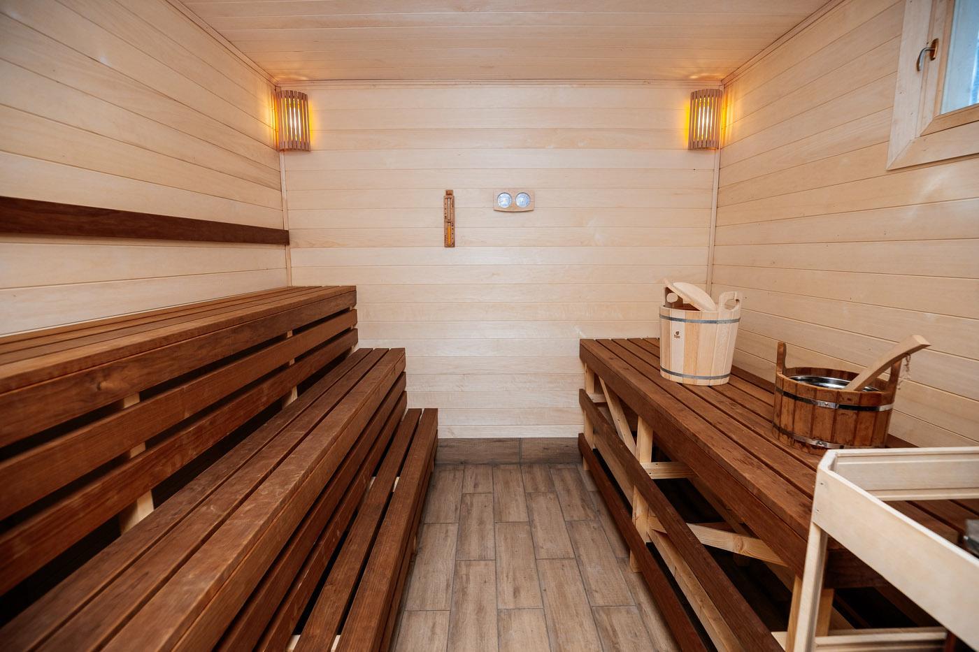 Большая парная, стол для парения и спа процедур, зона отдыха с видом на Большое Медвежье озеро и релакс зона с оборудованной кухней.